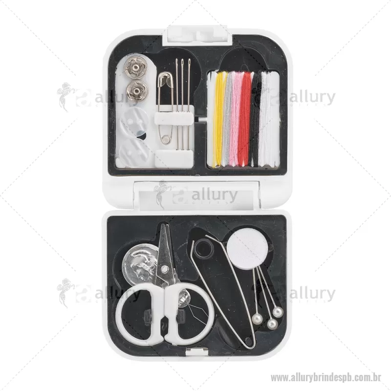 Kit de costura prático e leve para viagem Conjunto de costura prático e leve para levar em viagem. Composto por 3 alfinetes, 3 agulhas, 1 pinça, 1 tesoura, 1 enfia linha, 1 alfinete, 2 botões, 2 colchetes e 6 rolos de linhas de várias cores. Fornecido em estojo. Medidas: 70 x 21 x 65 mm Peso do Produto (g.): 46 - - ALLPBFEM084