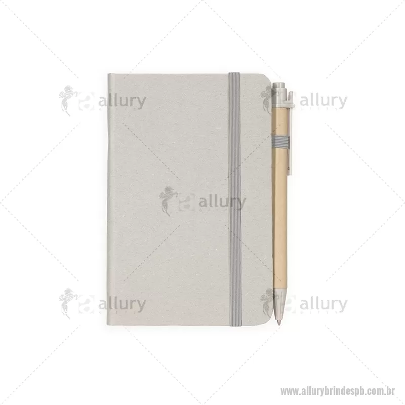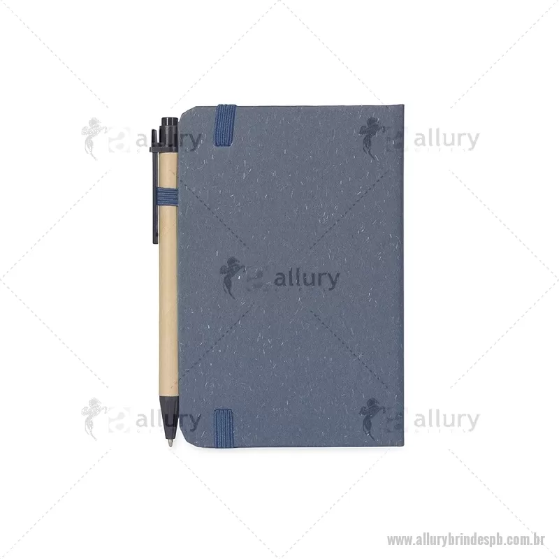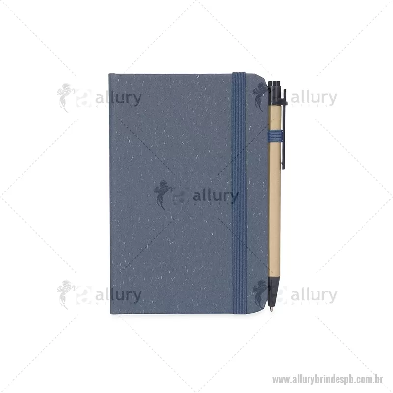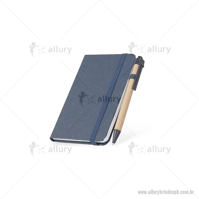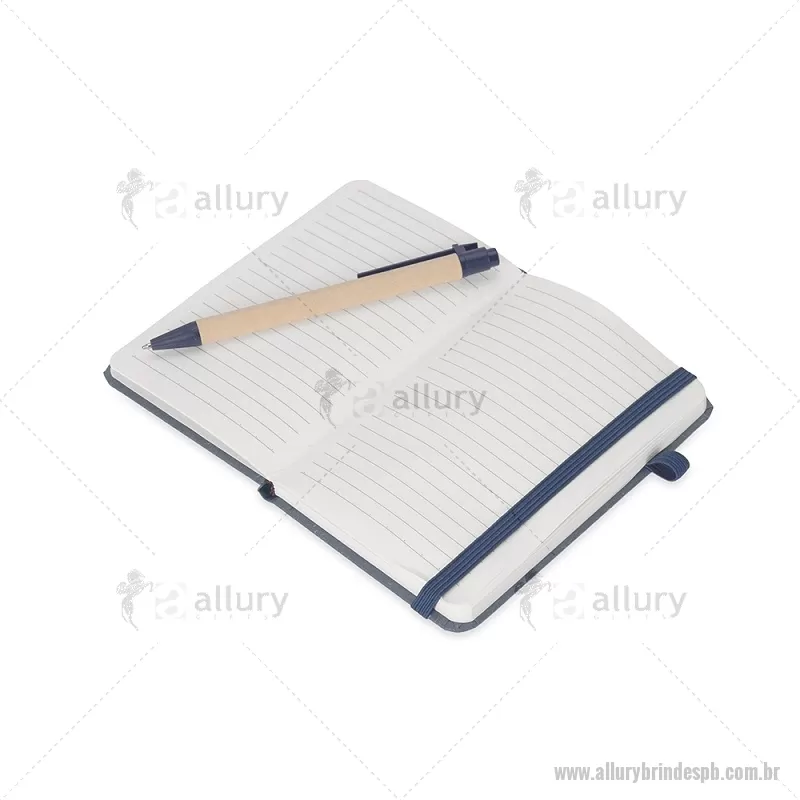 Caderneta ecológica com capa dura revestida em fibra de palha de trigo, contendo cerca de 80 folhas pautadas, duas folhas de guarda, elástico para fechamento e porta-canetas. Acompanha caneta esferográfica azul 1,0 mm com corpo em papelão, clip e acionamento por clique. - - ALLPBBLC270