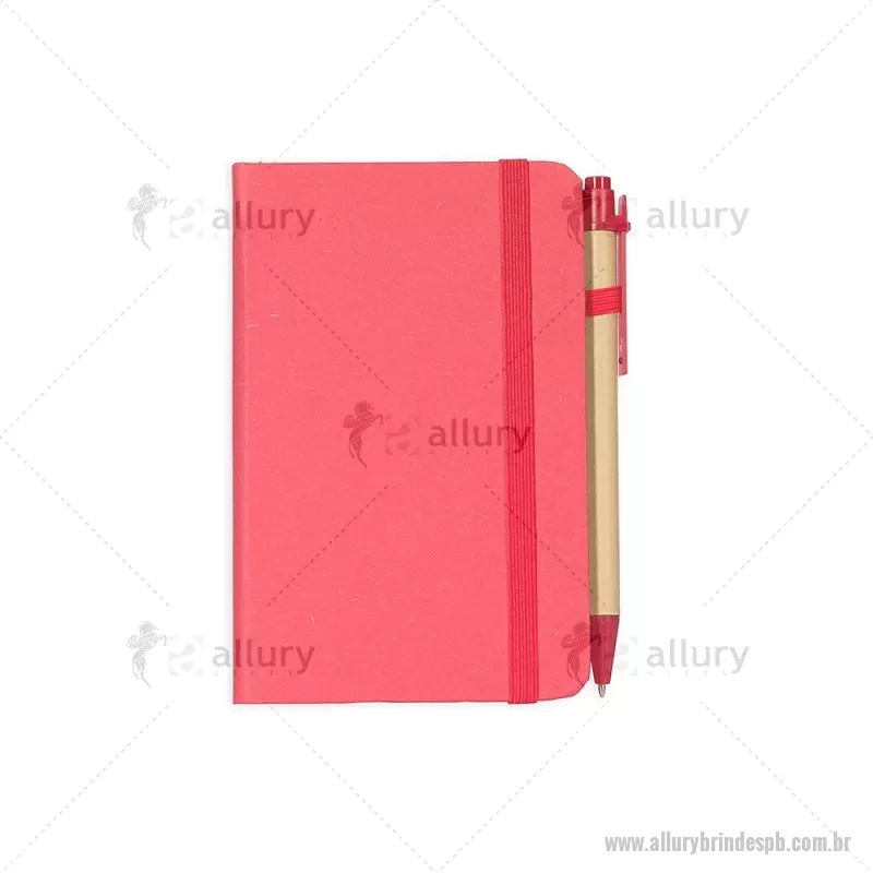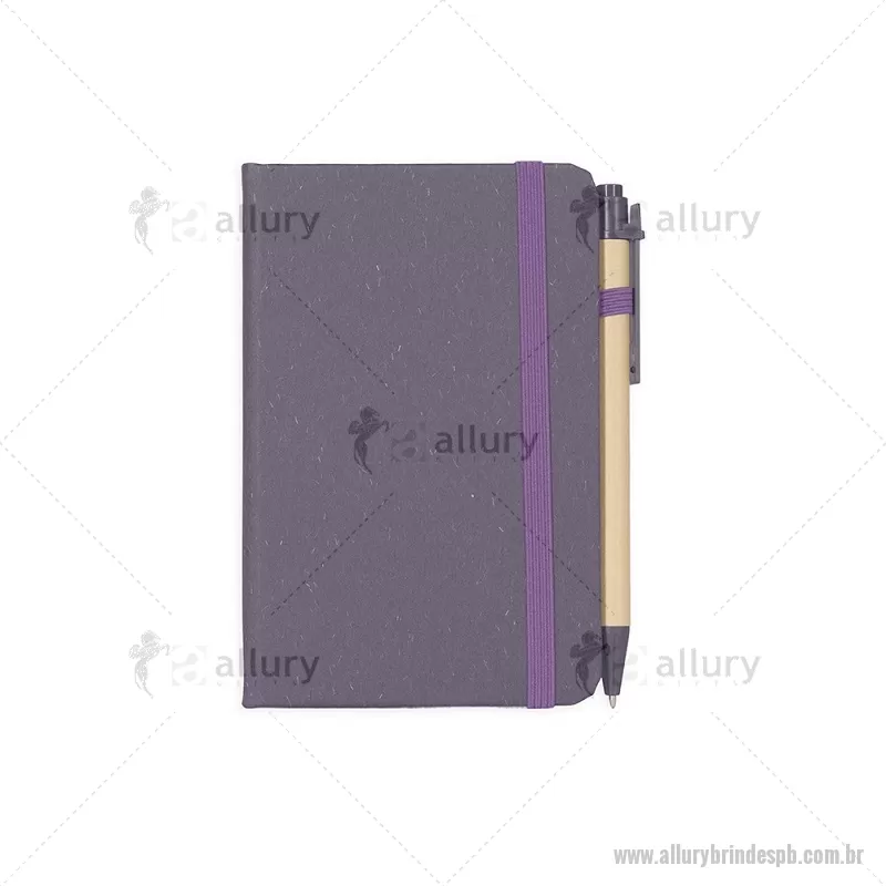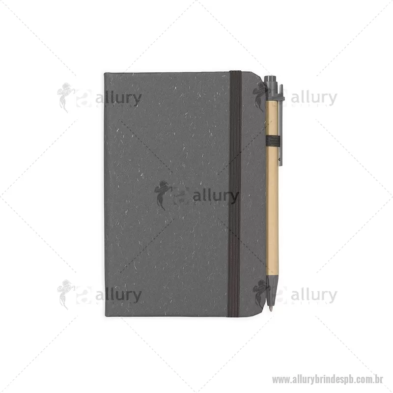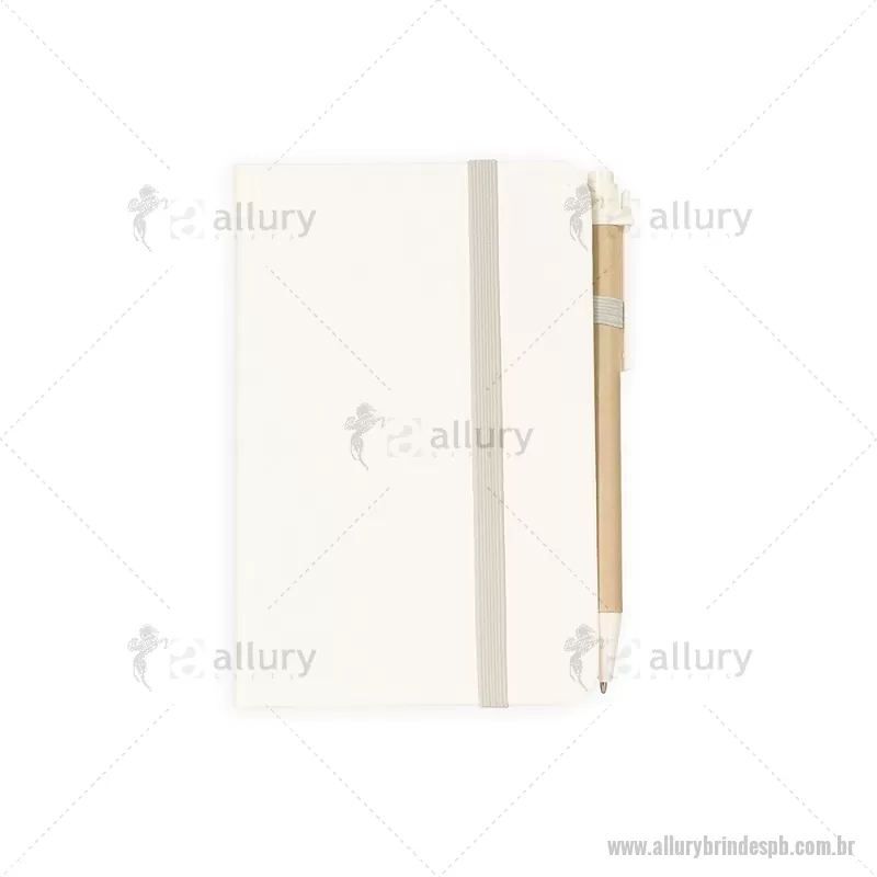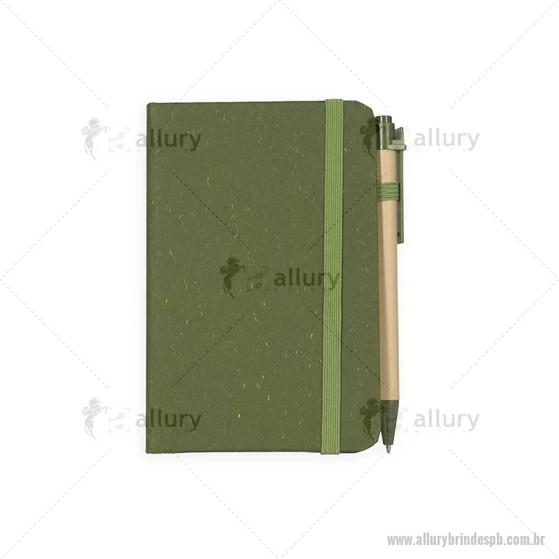 Caderneta ecológica com capa dura revestida em fibra de palha de trigo, contendo cerca de 80 folhas pautadas, duas folhas de guarda, elástico para fechamento e porta-canetas. Acompanha caneta esferográfica azul 1,0 mm com corpo em papelão, clip e acionamento por clique. - - ALLPBBLC270