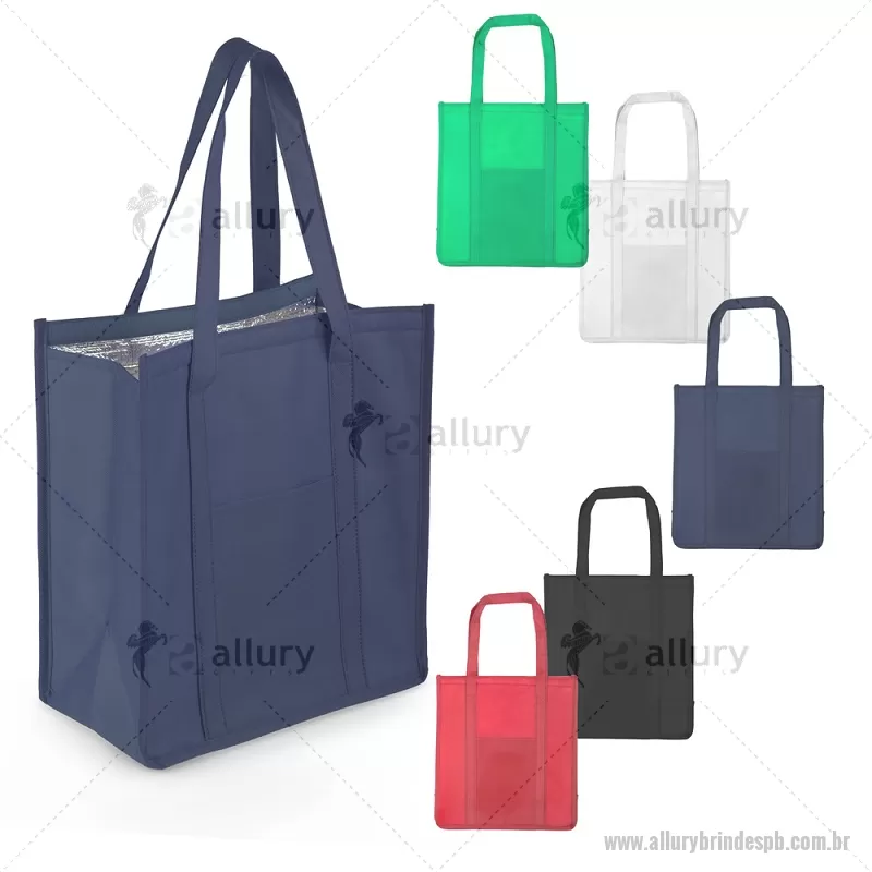Sacola térmica confeccionada em TNT com gramatura de 80 g/m². Possui interior costurado com revestimento em algodão e folha de alumínio de 2 mm, auxiliando na conservação da temperatura de alimentos e bebidas. Conta com bolso frontal, fechamento em velcro e alça de 50 cm de ponta a ponta, proporcionando praticidade no transporte. - - ALLPBBT118