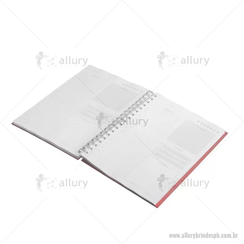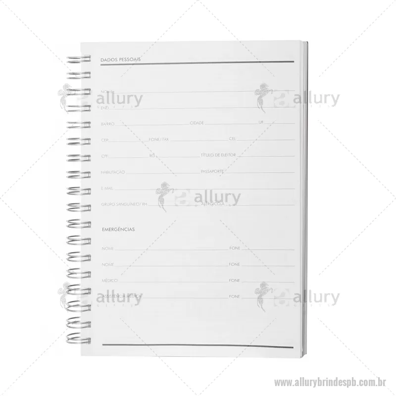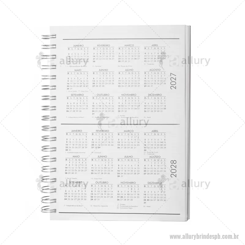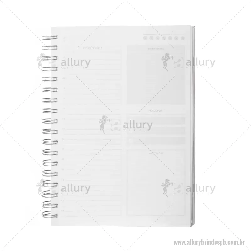Caderno planner em espiral com capa rígida em Percalux de 2 mm. Possui 90 folhas brancas de 95 g/m² com layout de planner, ideais para organização e controle da rotina. Inclui páginas de dados pessoais, calendários de 2025 a 2028 e espaços para anotações mensais. - - ALLPBCAD034