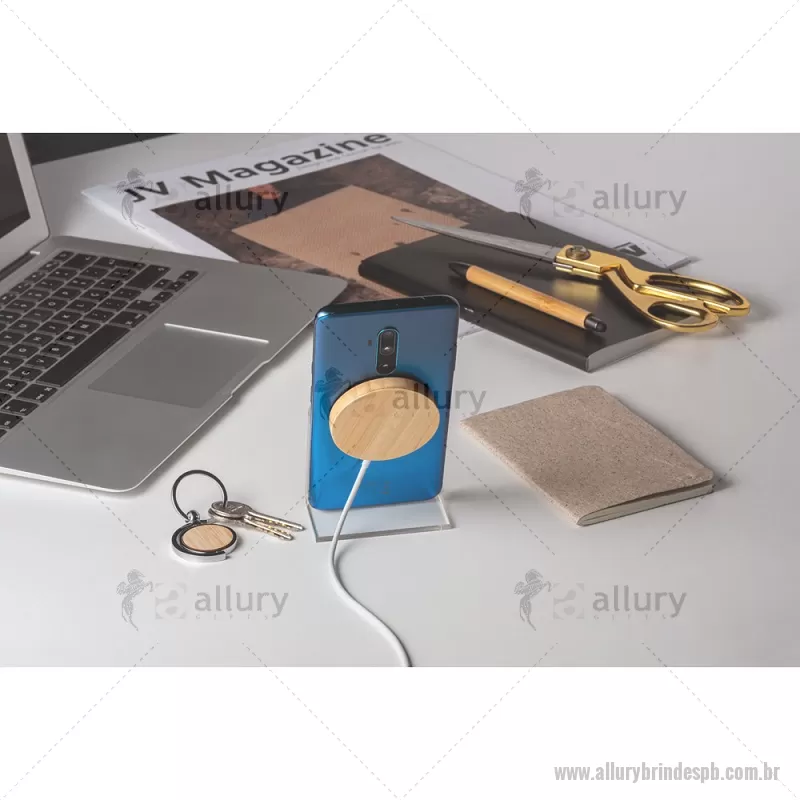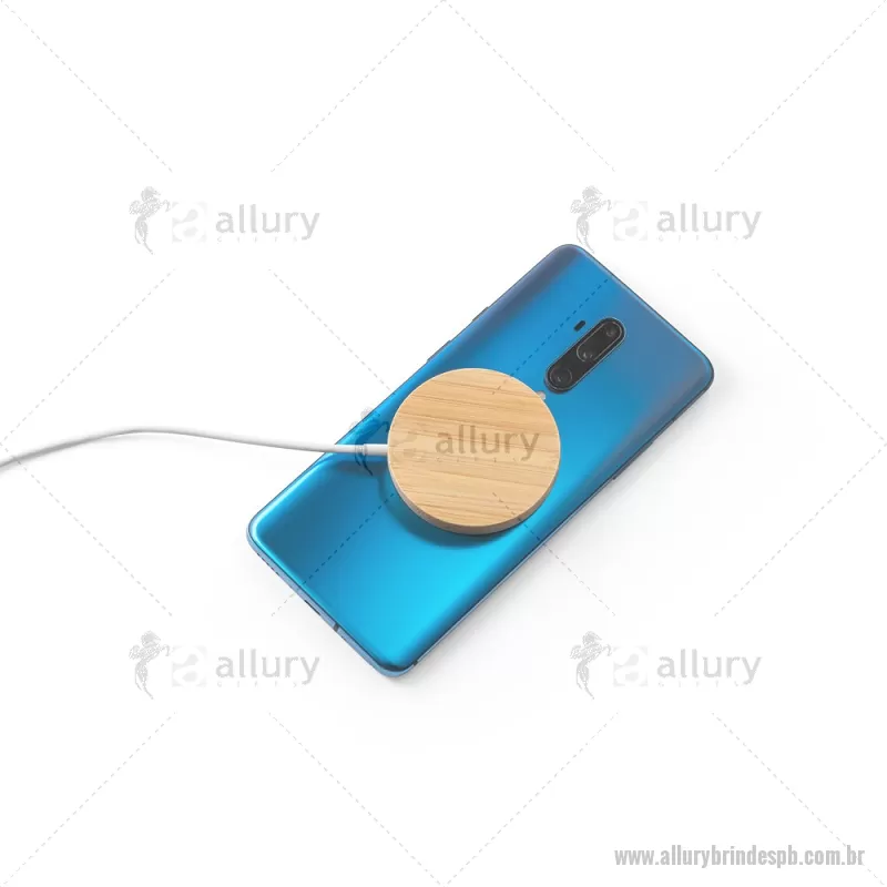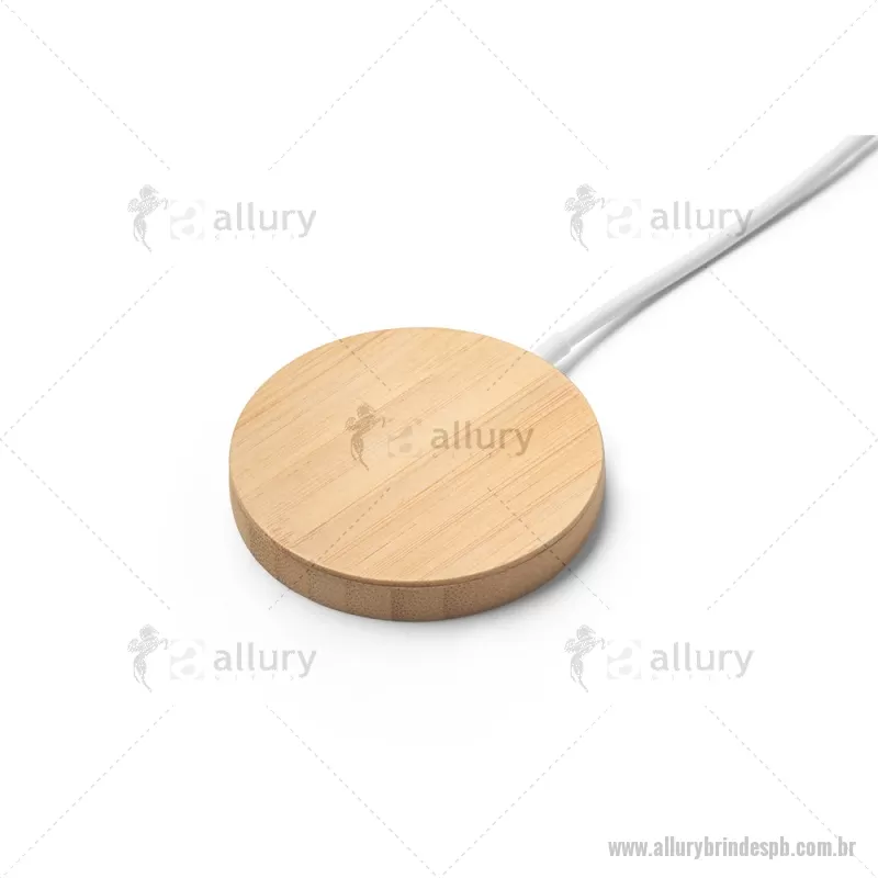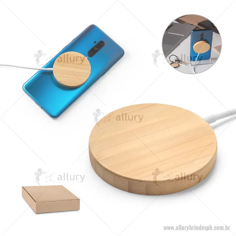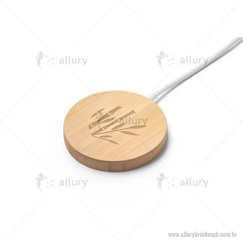 Carregador magnético por indução super-rápido em bambu 15 W Carregador magnético por indução (wireless) super-rápido em bambu. Potência de carregamento super-rápido de 15W. Incluso cabo de carregamento USB-C de 1 metro. Compatível com dispositivos móveis com tecnologia de carregamento sem fios. Fornecido em caixa presente de papel kraft reciclado. A cor e o resultado da impressão nos materiais naturais pode variar entre produtos. Medidas Produto: Ø59 x 8 mm Peso do Produto (g.): 35 - - ALLPBTEC533