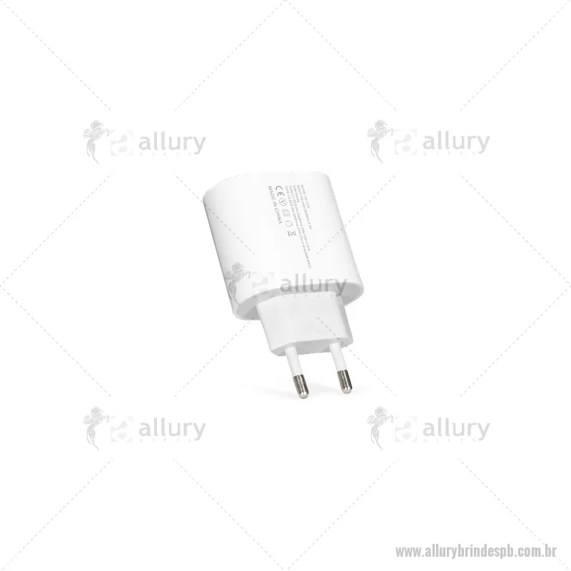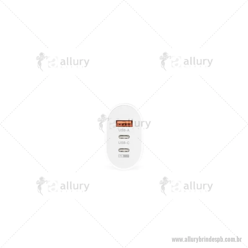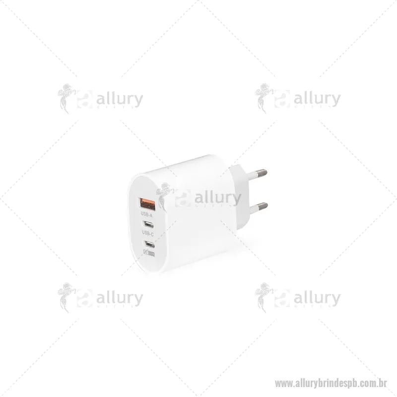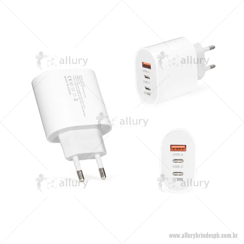 Carregador rápido em plástico leve e compacto, com três portas: uma USB-A e duas USB-C, incluindo uma opção de carregamento rápido de 20W. Ideal para recarregar diferentes dispositivos com praticidade. Cabo USB não incluído. - - ALLPBTEC535