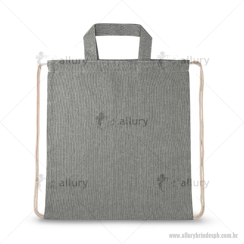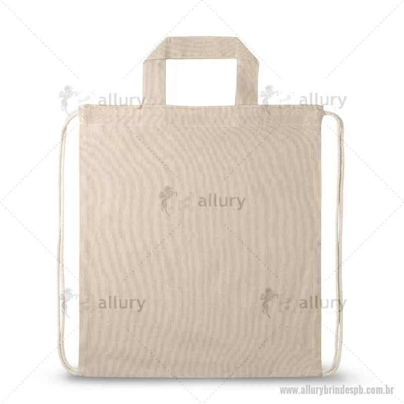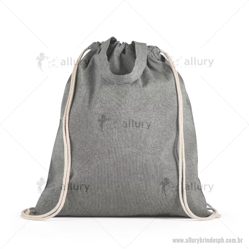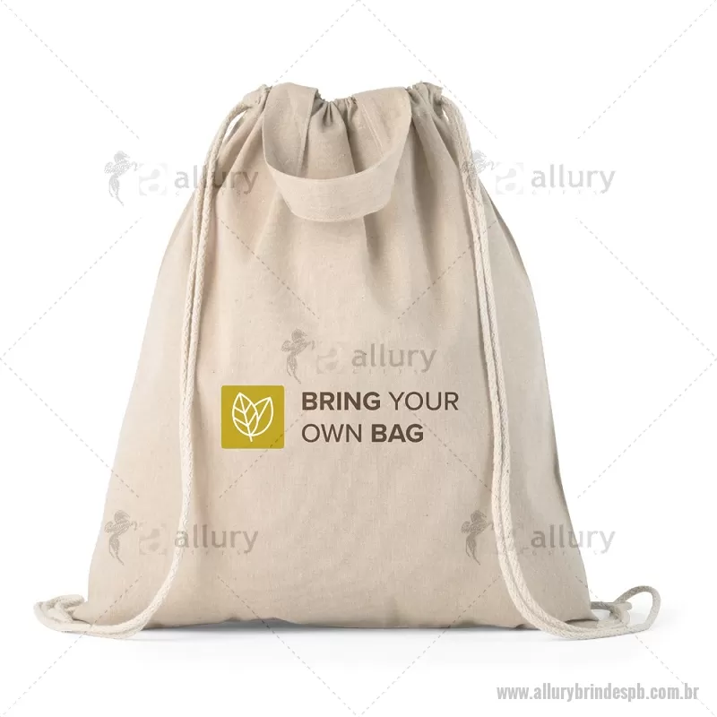 Sacola tipo mochila saco em 70% algodão reciclado e 30% poliéster reciclado (140g/m²), com alças 30 cm. O tecido é sem tingimento, e utilizado na sua cor original, sem produtos químicos de tingimento ou branqueamento, contribuindo para um menor impacto ambiental. Medidas: 370 x 410 mm Peso do Produto (g.): 80 gramas - - ALLPBMCS025