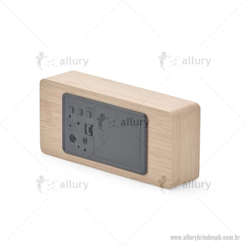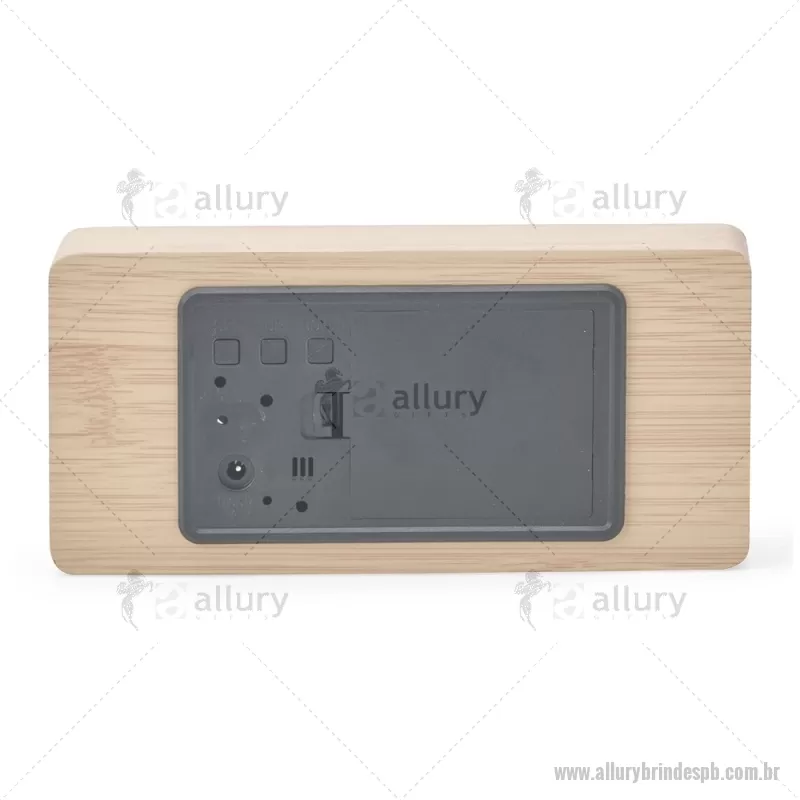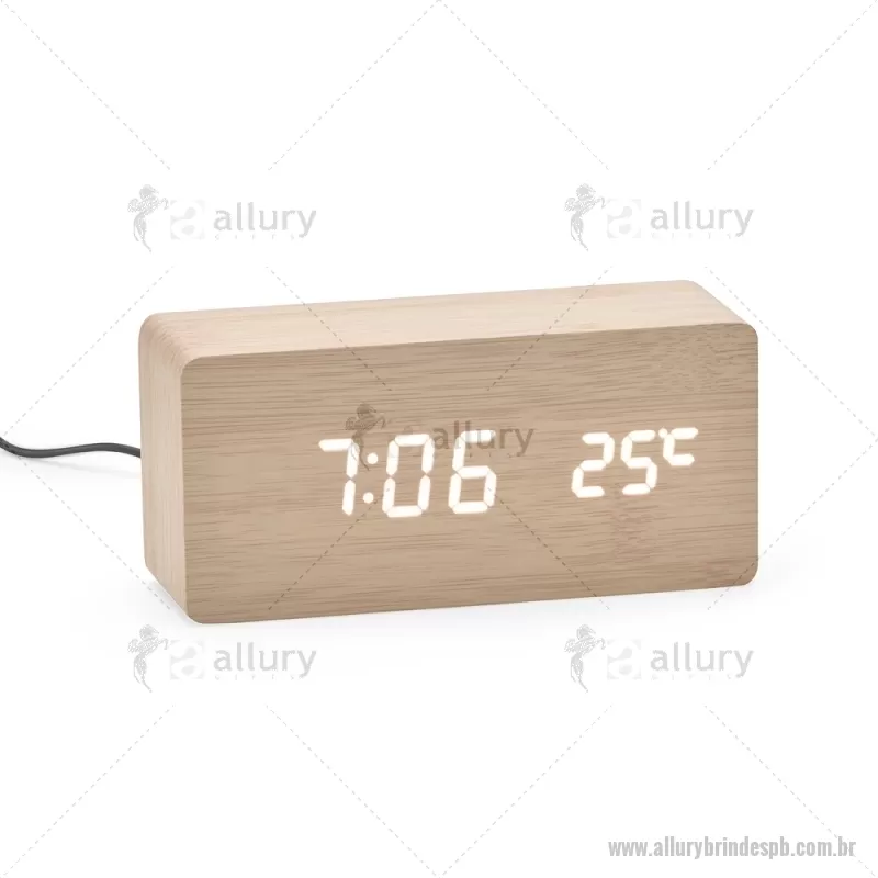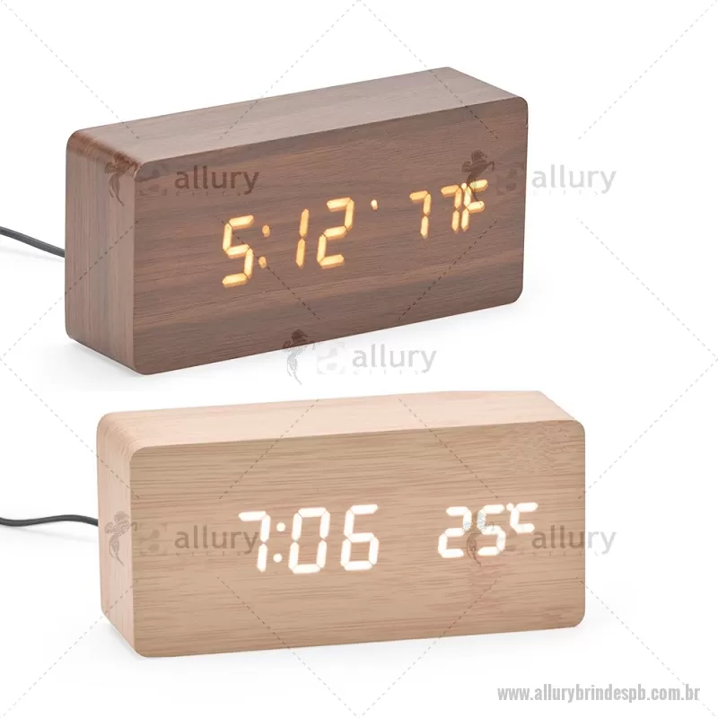 Relógio despertador em madeira com display LED, que combina design elegante e tecnologia moderna. Exibe horas, data e temperatura ambiente, além de permitir a programação de até três alarmes com diferentes configurações. Pode ser alimentado por 4 pilhas AAA (não inclusas) ou por cabo USB DC 5V, que acompanha o produto, oferecendo praticidade para o uso diário. - - ALLPBREL023